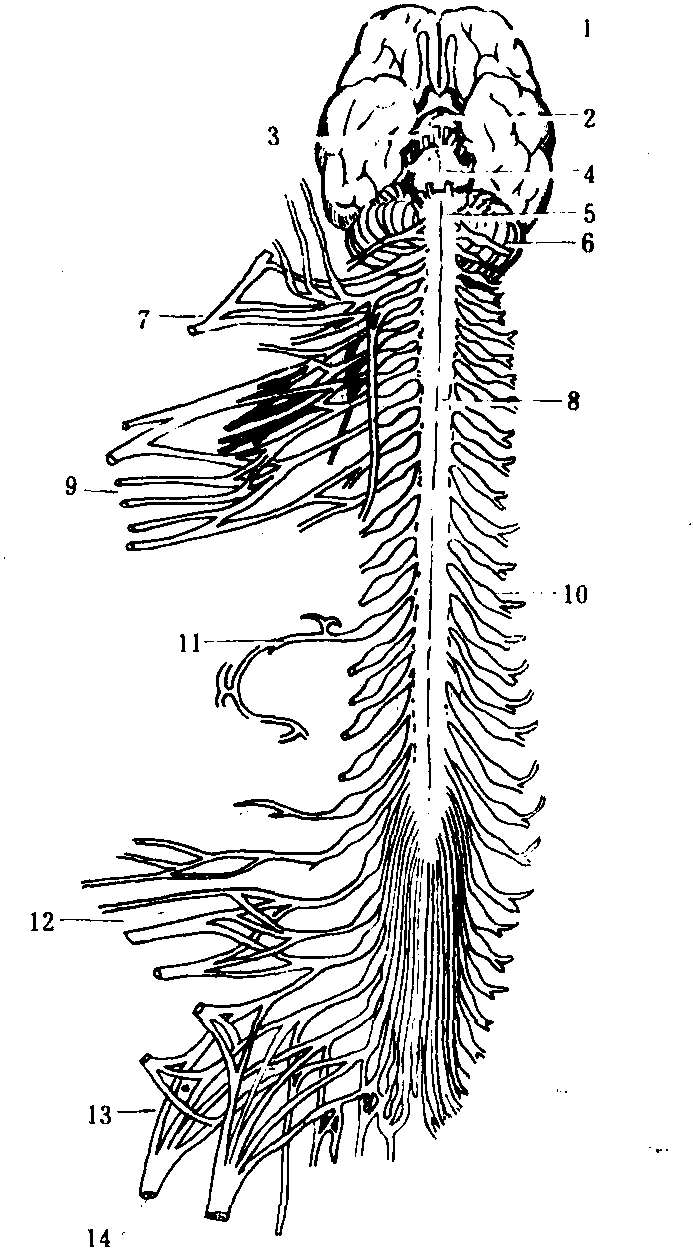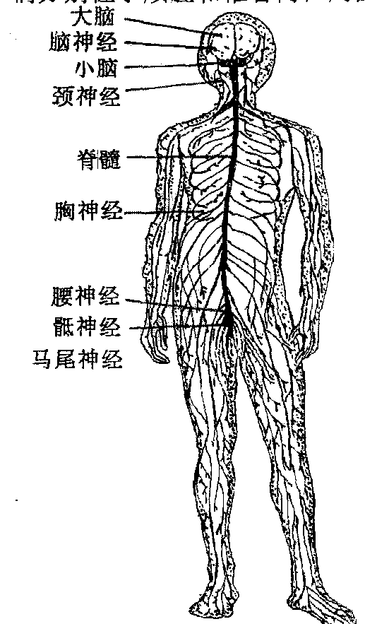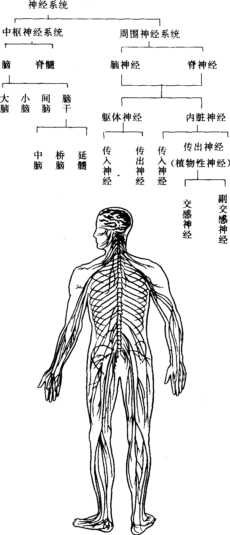 图1-27 人的神经系统 ☚ 神经系统 中枢神经系统 ☛ 神经系统nervous system是调节多细胞动物生理活动的体内互相联系和适应外界环境变化的全部神经装置。人的神经系统由脑、脊髓与它们相连的脑神经、脊神经、植物性神经和神经节共同组成。神经系统的功能活动状况,对全身各个系统、器官、组织等均有影响。如神经系统中枢部位或末梢神经部分发生病变,均可使其所支配区域的其他组织发生变化,产生相应的症状与体征(图)。