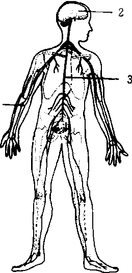 1.脊神经 2.脑 3.脊髓 人体的神经系统 脑位于颅腔内,分为脑干、小脑和大脑。脑干由延脑、桥脑、中脑、间脑构成。延脑与脊髓相接,间脑上连大脑,脑干背部与小脑连接。脑干中含有大量的神经纤维和神经核。神经核是神经元胞体的集团。绝大部分脑神经由神经核发出。在延脑和桥脑中有许多重要的神经中枢,分别调节呼吸,心血管,消化等生理功能,这些中枢若受损伤则可危及生命,俗称活命中枢。小脑有维持身体平衡,调节肌紧张,协调机体随意运动的机能,当小脑受损或有疾患时,出现行路摇晃,动作不协调不准确。大脑由左、右大脑半球组成,是中枢神经系统的最高级部分。大脑半球表面是灰质(即大脑皮质),其上有许多凹凸不平的沟和回,增大皮层面积,使其功能更为复杂。大脑皮质可划分为许多机能区。运动区和躯体感觉区,分别是肢体运动和躯体感觉的高级中枢;视区、听区分别为视觉和听觉的高级中枢;语言机能区与说话、写字、认字和理解文字等机能有关(这是人类所特有的)。人类左、右大脑半球在功能上有一定分工,绝大多数人左半球管理语言功能,右半球管理非语词性认识功能(如空间辨认,音乐欣赏等),此称为半球优势。大脑皮层下是白质,联络各区皮质及皮质与皮质下中枢。内囊是皮质与皮质下中枢联系的唯一通道,此处是脑溢血的好发部位。内囊受损时往往出现一侧运动和感觉障碍(即偏瘫,俗称半身不遂)。基底神经节位于大脑半球深部,发生病变时可出现不自主的动作(称舞蹈病)。 脊髓位于椎管内。在其横切面上,灰质位于中央,呈蝶形,白质位于外围。位于前方的灰质叫前角,发出运动神经纤维,小儿麻痹症就是此处发生病变;后方的灰质叫后角,接受感觉神经纤维传入。脊髓是中枢神经系统的低级部分。 神经系统活动的基本方式是反射,即机体接受刺激作出反应的过程。反射活动是通过反射弧完成的,包括感受器、传入神经、中枢、传出神经和效应器五个部分。脊髓中有许多低级的反射中枢(如排尿、排便和膝反射等)。反射有两种:一种是生来就有的叫非条件反射(如吮奶);另一种是在后天形成的称条件反射,条件反射是建立在非条件反射的基础上,在生活实践中逐渐完善。脑神经共12对,主要分布于头部,脊神经31对,分布于四肢和躯干。脑神经和脊神经中即有传入的感觉神经纤维,又有传出的运动神经纤维。植物性神经主要是支配内脏器官平滑肌、心肌和腺体。它分为交感神经和副交感神经。多数内脏器官,即受交感神经支配,又受副交感神经支配,两者的作用往往相拮抗(如交感神经兴奋时心跳加快,而副交感神经兴奋使心跳减慢),在中枢神经系统的调节下,两者的作用又是协调统一的。即交感神经兴奋时,副交感神经常表现为抑制。 ☚ 内分泌腺 用脑卫生 ☛ 神经系统见“人体生理学”中的“神经系统”。 神经系统由中枢神经和它发出、遍布全身的外周神经所组成。前者分脑和脊髓;后者有躯体神经系统(12对脑神经和31对脊神经,与运动、感觉有关)和植物神经系统(与呼吸、循环、体温、生殖等有关)。 神经系统/中枢神经系统/周围神经系统/植物性神经系统/植物性神经及其功能失调/大脑/小脑/间脑/脑干/脊髓/交感神经/副交感神经/神经元/神经纤维/突触/三叉神经/坐骨神经/人体机能的调节/神经的营养作用/脑电图/老年人脑电图的变化/非条件反射/条件反射/睡眠/睡眠发生的机制/失眠/情绪的生理反应/老年人的脑重/老年人的神经细胞数量/脊髓的老年性变化/中枢神经系统的老化 ☚ 牵涉性痛 神经系统 ☛ 神经系统 神经系统人和多细胞动物体内调节各器官的活动和使机体适应内外环境变化的全部神经装置。主要由神经细胞组成。低等动物的神经系统较简单,只有一个神经网络。随着动物的进化,神经系统不断进化,向头部集中的倾向越来越明显,至人类已达到最高程度。高等动物的神经系统包括中枢神经系统的脑和脊髓以及周围神经系统的神经和神经节。神经系统在调节和控制机体活动的过程中,首先是借助于各种感受器接受内外环境的各种刺激信息,经周围神经传至脊髓和脑,通过脊髓和脑各级中枢的整合作用,再经周围神经传至各种效应器来调节和控制各系统的活动。神经系统的功能十分复杂,概括起来可分为两方面:一是使有机体内各系统成为统一的整体;二是使机体内各系统与外界环境保持相对平衡。人类神经系统的形态和功能是经过长期进化过程而获得的。由于生产劳动、语言皮层中发生了与动物不同的变化和飞跃,不仅含有与高等动物相似的各种感觉和运动中枢,而且还有语言和分析中枢。因此,人类的大脑皮层成为思维和意识活动的物质基础,使人类远远超出了一般动物和范畴。这样不仅能适应和认识客观世界,并且能主动地改造客观世界,从而使自然界更好的为人类服务。 神经系统的结构