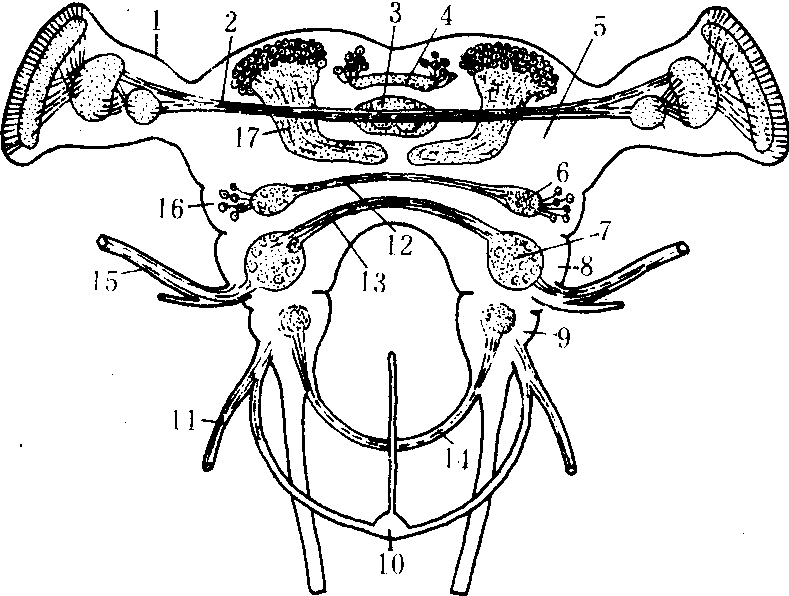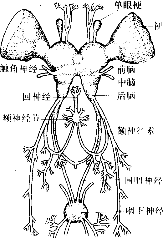 在解剖学上,昆虫的神经系统又可分为为中枢神经系统、交感神经系统和外周神经系统。 中枢神经系统 由脑和一条纵贯于腹面的腹神经索组成(图1)。 脑 昆虫的脑是神经系统中结构最复杂的部分,位于头壳内咽喉上方(图1),分前脑、中脑和后脑3部分。❶前脑,在脑的最前端。从外形看,发达的两前脑叶构成前脑的主体。前脑叶外侧为膨大的视叶,前脑的前背面有细长的单眼柄,前脑的神经主要通向复眼和单眼,为视觉中枢。前脑叶的内部结构复杂,包括球状细胞群、脑体(又称神经纤维体)及神经接索等结构。球状细胞是脑中特化了的联系神经元,组成1~3对球状细胞群,分别和不同的脑体相连。脑体由密集的神经纤维群和神经纤维球 (由神经末梢聚集而成的小团) 组成。脑体有4种: 脑桥体、中心体、蕈体和腹体(图2)。脑桥体位于前脑背部中央,脑中多处发出的神经纤维都进入脑桥体,故为联系中枢。低等昆虫脑桥体的背部两侧分别和一对球状细胞群相连。中心体在脑桥体下方,呈卵圆形。脑各部的神经末梢在此汇集,也是重要的联系中枢。蕈体位于脑桥体两侧,左右各一,形似蕈,是一个复杂的协调和联系中枢,其大小与复杂程度和昆虫行为的复杂程度有关。被认为是昆虫智能的标志。腹体在前脑后部两侧,左右各一,以横向的神经接索相连。少数昆虫在腹体外侧有球状细胞群。腹体有神经纤维同脑桥体、中心体、蕈体等相连,亦为联系中枢。鞘翅目和鳞翅目昆虫腹体较发达,发达程度和蕈体常呈负相关。前脑叶是一切活动及生长发育的控制协调中枢,脑间部具有成组的神经分泌细胞,其神经轴突向后伸入心侧体,具有分泌、贮存和释放作用。 ❷中脑,在前脑的后方,为两个膨大的中脑叶。中脑内部两侧各有一髓体,是触角神经中枢。两髓体间有神经接索相连。触角的感觉神经纤维在髓体周缘形成很多神经纤维球。 ❸后脑,位于中脑后部,分为左右两叶,通常不发达。后脑叶内有髓体,发出上唇神经。后脑髓体在后脑叶内,但连接两个髓体的神经接索却在脑的外部,并绕过咽部,故亦称围咽神经环。