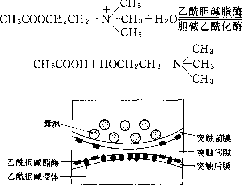 某些神经元的特定区域能自发地产生周期性的兴奋,如气管系统的通风运动就是由神经节内某些神经元自发的神经活动引起。 突触传递 突触是神经元之间、神经元与感受器或效应器之间的接触区域。突触前神经元的轴突末梢反复分枝,最后的小分枝末端膨大,与突触后神经元的小分枝形成了突触。一个神经元可有多达数千个突触,其形态和功能各异,为神经系统的整合和协调活动提供了基础。突触处的膜较其余部分的膜稍厚,分别称为突触前膜和突触后膜,二者之间称为突触间隙,由此传递神经元之间的兴奋。突触传递多为化学传递,且为单向性,只能由前膜传向后膜。传递引起的膜电位称作突触后电位,由于神经递质的性质不同,引起的突触后电位也不同。当突触前膜释放的神经递质引起突触后膜去极化时,产生兴奋性突触后电位。 昆虫神经系统中含有大量的乙酰胆碱和乙酰胆碱酯酶。乙酰胆碱可能是昆虫中枢神经系统中主要的神经递质,存在于突触前膜内的小囊中,当兴奋传递到突触前膜时,引起膜的去极化,小囊因与膜碰撞而破裂,将乙酰胆碱释放到突触间隙,并迅速通过间隙与突触后膜上的特殊位点(受体)结合,引起突触后膜的去极化,当局部电位达到阈值时,形成动作电位。乙酰胆碱瞬即被膜上的乙酰胆碱酯酶水解,水解产物为突触前膜吸收,在胆碱乙酰化酶的作用下再合成乙酰胆碱,贮于小囊内,为下一兴奋传递准备条件(图4 )。昆虫神经系统中还有其他神经递质,如肾上腺素,5-羟色胺,多巴胺等。当突触前膜释放的神经递质引起突触后膜超极化时,产生抑制性突触后电位。r-氨基丁酸可能即是此类递质。神经和肌肉接点处的兴奋性递质不是乙酰胆碱,部分昆虫中已证明是谷氨酸。