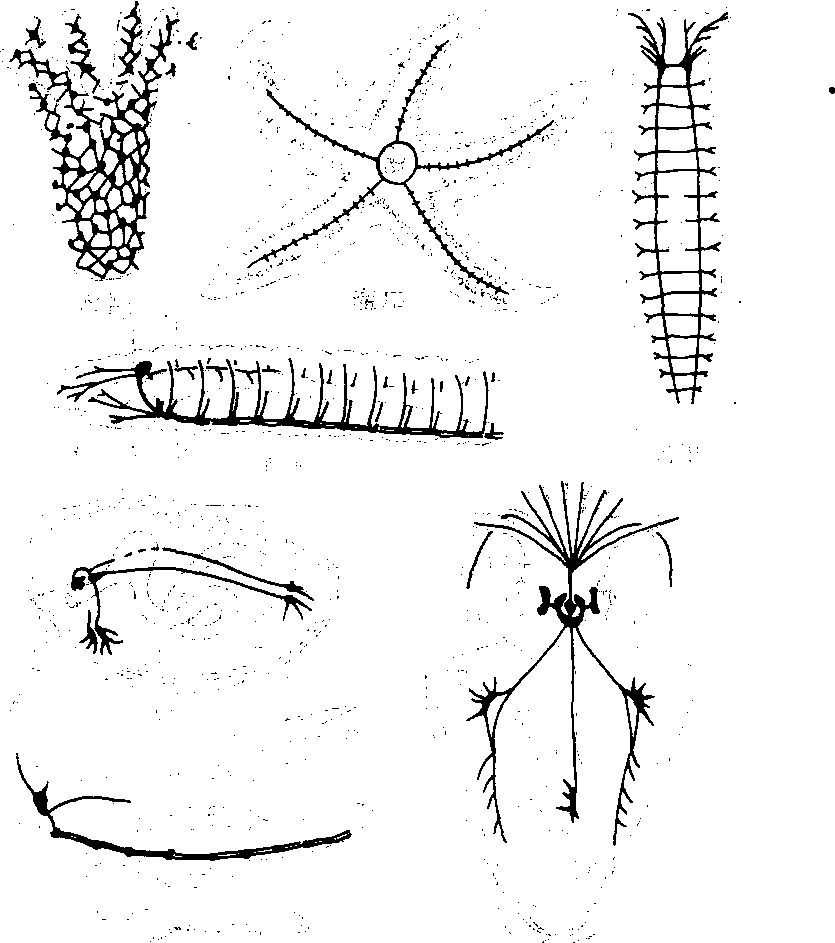 网状神经系统 又称散漫神经系统。海绵动物虽已有具神经特性的细胞,但分散而未形成神经系统。网状神经系统见于腔肠动物等辐射对称的低等动物,如水螅和水母,及棘皮动物如海星,是最原始和最简单的神经系统。在水螅的外胚层下和内胚层下,分布有双极和多极神经细胞,又称原始节细胞,相互连接形成神经网,而以口部较集中。感受器是内、外胚层中的感觉细胞; 效应器是上皮肌肉细胞。神经细胞相互间及与感觉细胞间,直接或以突触相连接; 与上皮肌肉细胞间形成神经肌肉连接或突触。感觉细胞受刺激后,发出神经冲动,通过神经网的传播,影响上皮肌肉细胞,产生收缩反应;神经传导一般是无定向的,传导速度也较慢。在水母的神经系统中可见到神经成分最原始的集中形式,除神经网外,有些水母沿伞部边缘由神经细胞和纤维形成神经环,此环与伞部和触手的神经网相连接,并接受来自伞缘的8个感觉小体(含有嗅觉窝、平衡器和眼点) 的神经纤维。神经环中的神经节又能产生节律性冲动,使水母体进行有节律的收缩,保证在海水中游动。棘皮动物如海星的神经系统与腔肠动物相似,只具有感觉细胞和原始节细胞,但除形成浅层的神经网即所谓基上皮丛外,尚在深部形成较集中的神经环和辐神经索。神经环围绕口部,主要含有大量感觉细胞的突起; 辐神经索由神经环呈放射状至腕部,含有大量运动性原始节细胞。神经环与索的连接处是腕部的运动协调中枢。 梯形神经系统 见于扁形动物(如涡虫)、线形动物(如蛔虫)和某些原始种类的节肢动物 (如原气管类的栉蚕)及软体动物(如双神经类的石)。当动物的体型向左、右对称的方式演化并分化出头、尾端和背、腹面时,神经系统也呈两侧对称并开始向头部集中,同时形成了中枢神经和周围神经。中枢神经是深部3~5对纵行神经索或干,以横连合相连; 神经细胞体多聚集于纵、横神经的交叉处。周围神经是由纵索分出的一系列侧神经,形成周围神经丛,根据分布可分为上皮下丛和肌下丛。涡虫以身体腹面爬行,身体腹侧的一对腹纵神经索较粗,由规则的横连合相连,因而呈梯形; 纵索前端在头部形成一对脑神经节。线形动物围绕咽部形成神经环,向前分出6条短的神经到唇部;向后分出6条长神经索即背、腹纵神经和两对侧纵神经到体后端,以腹纵神经索较粗并具有较发达的神经节。6条神经索间有一系列横连合相连,因而呈圆筒状。 链状神经系统 见于环节动物、节肢动物和软体动物。由于两条腹神经索相互靠拢,横连合缩短,一对腹纵神经及其成对的神经节发生程度不等的合并现象,于是中枢神经由梯形逐渐过渡为链状。在环节动物如蚯蚓,咽的背侧是一对咽上神经节构成的脑神经节,以两条围咽神经与咽腹侧的一对咽下神经节相连;由此向后接双股合成的神经索,沿体节分布有一系列神经节,此神经链构成中枢神经。由脑神经节和围咽神经分出神经至头部感觉器官和咽壁; 由咽下神经节发出神经至第2~4体节; 由神经链的每一神经节发出2~5对侧神经至各体节的皮肤肌肉囊。以上组成周围神经。由脑神经节还发出神经至咽、食道和肠、组成交感神经。在蚯蚓,上皮中的感觉神经细胞、神经节内的中间神经元和运动神经元,构成简单的反射弧,完成本体节和相邻体节的反射活动,进行蠕动。此外,在神经链中还具有超巨纤维,由头端几个巨细胞的轴突融合而成,贯串整个神经链,沿途分出侧支与各神经节内的运动神经元相联系。巨纤维的传导速度很快,可引起纵肌同时作用,使身体迅速收缩,逃避伤害。此外,环节动物体内还有分布很广的周围神经丛,特别在皮下和体壁的肌层间,有人认为是网状神经系统的遗迹。 软体动物的神经节和神经索因发生合并现象而数目减少。在蜗牛,神经节有成对的脑神经节、足神经节、脏神经节、侧神经节和壁神经节。脑神经节分出神经至头部感觉器官如眼、触角、平衡囊和嗅检器。从脑神经节向腹侧分出一对足神经索至足神经节,后者支配腹足; 又分出一对脏神经索至脏神经节,后者分布于内脏; 侧神经节的分支支配外套膜; 壁神经节的分支则支配体壁和外套膜。至双壳贝类,神经节合并为3对:一对脑-侧神经节位于食道两侧,由其分出一对上神经索向后至脏-壁神经节,后者分支供应外套膜、闭壳肌和内脏; 又分出一对神经索向腹侧至足神经节,支配斧足。双壳贝类的感觉器官一般不甚发达,大部分位于外套膜边缘,除感光器官、平衡器和嗅检器外,还有一些分散的感觉细胞。 高等软体动物的头足类如乌贼和章鱼,及高等节肢动物如昆虫和蜘蛛,链状神经系统达到最高发展。其特点是: ❶发头现象,即感觉器官、神经组织和采食器官向身体前端集中,形成头部; ❷神经链上的神经节由后向前趋向合并; ❸神经元的胞体集中于神经节,神经索中仅含有神经纤维; ❹神经系统的各个特定部位担负特定功能。头足类的大部分神经节在食管周围集中甚至合并,形成脑。包括:脑神经节、侧神经节、足神经节和壁神经节。由脑发出的神经以及少数神经节,构成周围神经。包括: 一对视神经,由脑神经节发出,基部并有两个大的视神经节,又称视叶; 一对粗大的外套膜神经,至外套膜内面的星芒节,分布于外套膜; 若干至腕部的神经,由足神经节发出; 至胃神经节的神经,分布于消化管等内脏。脑的不同部位控制身体的不同功能