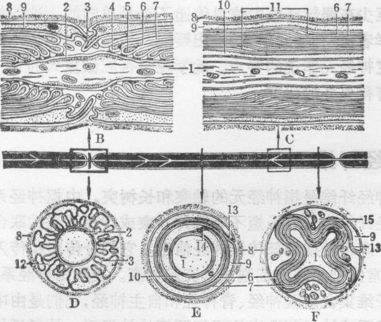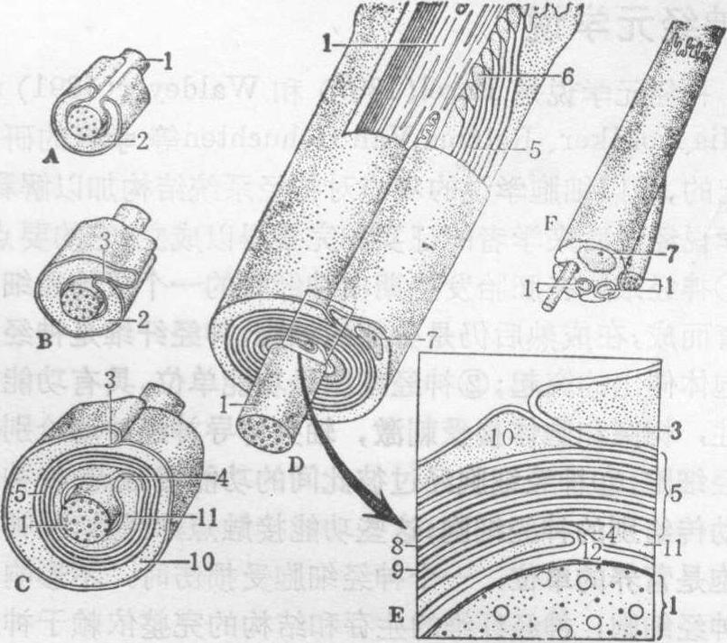 图1 周围有髓神经纤维超微结构模式图 A光镜下有髓纤维纵切面。黑色部分示髓鞘,中央白色部分示轴突,V形裂缝示Schmidt-Lantermann裂隙 B.为A图左侧方格的电镜图,示Ranvier结的纵切面 C.为A图右侧方格的电镜图,示Schmidt-Lantermann 裂隙的纵切面 D.Ranvier结横切面电镜图 E.结间体横切面电镜图,髓鞘板层只绘几层示意 F.结旁区横切面电镜图 1.轴突 2.膜内致密层 3.指状突起 4.致密突起5.胞质囊 6.主致密线 7.周期内线 8.基板 9.外层胞质 10.内层胞质 11. Schmidt-Lantermann裂隙 12.间隙物质 13.外轴系膜 14.内轴系膜 15.胞质柱 髓鞘是Schwann细胞的胞膜内折所成的轴系膜紧密卷绕轴突所成(图2)。每个Schwann细胞形成一个结间体。电镜下,成熟的髓鞘是多层呈同心圆规律配布的板层结构(图2,D,E)。板层的重复单位厚17~18.5nm,相当两层细胞膜。暗板层着色深,厚3.5nm,是两层细胞膜的胞质面并合所成,称主致密线。主致密线间为着色浅的明板层。此层中有较深而不很清楚的周期内线,厚约2nm,是两层细胞膜的外表面并合所成(图2)。主致密线和周期内线大概代表细胞膜的蛋白质,明板层代表细胞膜中的脂类。Schmidt-Lantermann裂隙为螺旋状卷绕的板层局部分离的区域(图1)。此区的板层沿主致密线分开,其间有细胞质存在。Schwann细胞的胞质大部分存留在髓鞘的外侧和内侧,且以外侧较多。轴突周围有宽10~15nm的间隙,称轴周间隙。髓鞘外面和内面的板层各与外、内轴系膜相连。外和内轴系膜于靠近细胞表面处分开,与Sch-wann细胞的膜相连(图2)。结间体末端称结旁区。此区髓鞘外侧胞质多,聚成纵向的胞质柱(图1)。胞质柱向Ran-vier结伸出多个指状突起(图1,F)。结两侧的指状突起互相嵌合,末端贴附轴膜,故Ranvier结处轴突并不真正裸露。结旁区髓鞘板层依次分离,含胞质多,在神经纤维纵切面上呈舌状囊(图1)。这些胞质囊紧贴轴膜,两者之间有细短的致密突起相连(图1)。Ranvier结的这些微细结构大概与轴膜内、外离子迅速交换有关,但其细节还不了解。Ranvier结处轴突含线粒体较多,轴膜内面有与轴突起始段相似的膜内致密层。有髓纤维传导神经冲动的速度比无髓纤维快。传导速度与轴突直径,尤其与髓鞘厚度和结间体长度成正比。因髓鞘富有脂类,有绝缘作用。Ranvier结和轴周间隙可供轴膜内外交换离子。有髓纤维传导神经冲动,是由一个Ranvier结到另一个结的跳跃式传导。