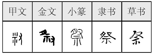 祭zhài ❶ (古国名) Zhai, a state in the Zhou Dynasty ❷ (姓氏) a surname: ~ 彤 Zhai Tong 另见 see also jì。 ◆祭公 a suranme 祭offerings 祭祭,甲骨文作  ,金文作  ,小篆作 。 甲骨文从又持肉會意,“肉” 旁或有數個小點表示滴血。金文增从示爲意符,“示” 即神主,合體表示以手持肉祭祀祖先。所从之“又”或作 “丑”,或作 “攴”,表意相同。金文字形多種,主要是結構部件位置不同,若據之隸定則有多個異體。卜辭、銘文多用本義。 楚簡帛文作 ,沿襲古體。秦簡牘文作 ,古隸典型。 祭jì会意字,左上角为“肉”,古代的祭品,右上角为“又”(即“手”),下为“示”,意为手持祭品,供奉神灵。祭,又读zhài,古代姓氏,《左传》中有“祭仲远”者。这个读音作为声符尚保留在瘵(zhài)、蔡(cài)、察之中。作声符生成的字有: jì 际(“際”的简化,国际) 漈(水边) 穄(草本植物) (海边的一种鱼) chì 傺(侘傺,失意貌) 祭 甲骨文; 金文; 篆jì[手持肉置於石桌。(《説文》:“祭,祭祀也。從示,以手持肉。”祭:甲骨文“從血從又”,像一人用手(又)端起一盆血以敬神。到了金文血改成了“月(肉)”。楷化爲“祭”,與古文字相差無幾。祭,祭祀神、佛、祖宗。)] 《詩經·豳風·七月》:“四之日其蚤,獻羔祭韭。”(二月早起祭祀忙,供上羊羔和韭黄。) 祭*jì(11画)