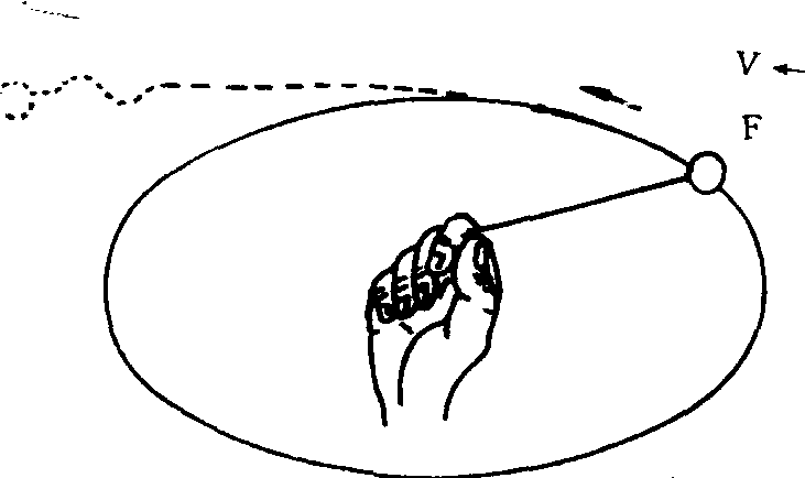 体上。如单杠大回环,离心力作用在单杠上,是单杠受到的力。离心力和向心力分别作用在两个物体上的一对相互作用力, 它们同时产生, 同时消失。据此,人在弯道跑时, 采用倾斜身体等合理的弯道跑技术的目的是要使人体所受到的向心力足够大,以便能够顺利地通过弯道。而不是为了克服离心力, 因为离心力不作用在人身上,是作用在地面上的。同理,铁饼的出手也不是离心力的作用,而是由于脱手时作用在铁饼上的向心力消失,铁饼因惯性而保持原有的运动状态, 沿与曲率半径相垂直的切线方向飞出。如同图中的小球,当它作圆周运动时,必有线拉着小球,拉力的方向沿着半径指向圆心,