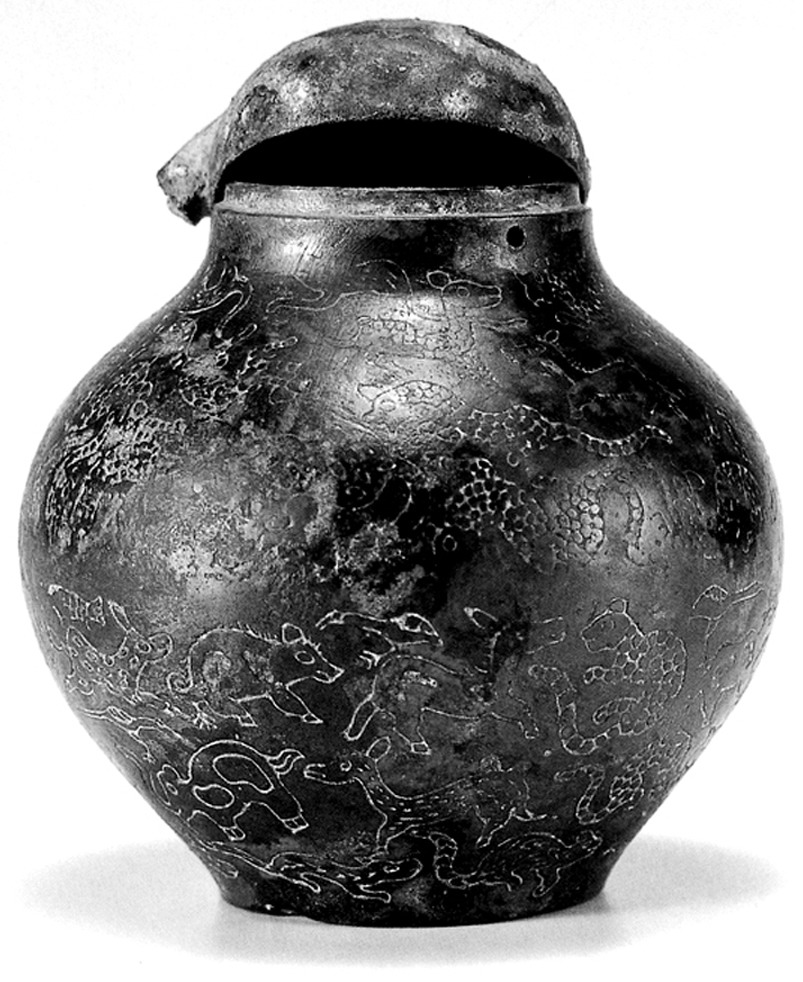 | 释义 | 禽兽纹壶 禽兽纹壶qinshouwen hu春秋铜酒器。1982年8月淳化县夕阳公社(今方里镇)秋社村春秋墓出土。通高11厘米,口内径4.2厘米,底径4.8厘米,最大腹径9.5厘米,重0.4公斤。直口,短颈,圆肩,鼓腹,平底,体为球形。口沿外有子母口和对称小孔,孔上器沿处有小缺口。出土时上覆一盖,盖作半球形,口为椭圆形,径稍大于壶口,无套合的子母口,形状似勺,似非原器之盖。盖面光素,近沿处有倒流状空心小钮,但与盖内不通。壶体外饰阴线刻禽兽60余种,可辨者有长颈鸟、长足鸟、麋、象、牛、骆驼、猪、蛇、狼、狐狸、兔、犬、鼠、鱼、凫、鹤、鸡、豹、龙等。这些动物图像造型各异,繁简不同,好似“百兽图”。现藏淳化县文化馆。