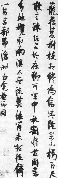 | 释义 | 作小楼双树间诗轴 【简介】: 明·张瑞图书。绫本。行书。书七言律诗一首,凡四行,每行字数不一,共六十一字。140.6×46.7cm。日本京都博物馆藏,刊于日本《书道全集》(二十一)。 【赏析】: 张氏行书结体轩昂伟岸,茂美平易;用笔则以侧锋方势逕直往来,一派从容怡然,不作收藏转衄之法,亦无草体那种紧駃怒奔之态。所以,张氏行、草往往是两种旨趣逈异的境界美感。《作小楼双树间诗》这件行书用笔肥厚而存之方势以见骨骾,故无俗姿;其纤细者如同枯槎架险,神秀筋强,亦不病韵;而整体上的纤浓疏密的鲜明对比,使得作品具有较好的形式美感。张氏行书之所以如此构筑,大槪是书家有意地展示生活、感情和性格的另一个侧面吧。
