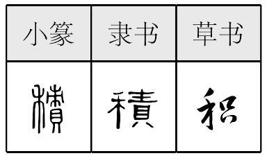 【提示】禾,中间是竖,不是竖钩; 位于字左时,末笔捺改点。 *积(積)jī10画 禾部 (1) 聚积;累聚: ~存|~压|堆~|~土成山|日~月累。 (2) 长时间积累下来的: ~习|~弊|~案。 (3) 停滞;中医特指儿童消化不良的病: 食~|奶~。 (4) 乘积,乘法运算的得数。 积積jī甲骨文以来的责字从贝(貝),朿(cì,刺本字)声。西周金文用为“债”,春秋以来用为“绩”或迹(蹟)。引申有“积累”“聚集”义。战国时小篆又增禾旁作“積”,成为形声字。义为聚集。如:积少成多|积年累月|积劳|积习。现代简化作“积”。从禾,只声(现代方音“只”与“积”音近)。现作为规范简化字。算术乘法的得数叫“乘积”。简称叫“积”。 积積★繁◎常★常