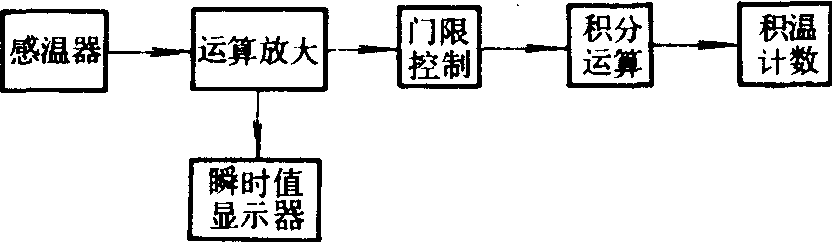 积温仪jiwenyitemperature integrator用来测定一定时段和某个温限内温度累积值的仪器。20世纪50年代开始制作。最早的积温仪只用一个测温头、一个温限工作。现已发展成用一个测温头、多温限数字显示的新积温仪器。其测温范围一般为0~50℃,分辨率为0.1℃。积温原理如图1。设函数T(t)表示某处的温度T随时间t变化的情况, 将T(t)曲线下的各个小面积叠加即可求得该处的积温值。当△t→0 分运算电路进行运算。积温仪的基本结构如图2所示。感温器中的感温元件, 可以是热敏电阻, p-n结感温元件或其它的感温元件。感温器的输出电压被送到运算放大器进行放大后, 分成两路输出, 一路送到瞬时值显示器中, 直接显示出感温元件所处环境的温度值: 另一路被送到门限控制器, 其中又可分为两种积温情况进行工作; 一种是测有效积温, 一种是测活动积温。有效积温线路中有低限 (又叫冷限)和高限(又叫热限)两个温度控制门串联联结,只有这两个门同时接通时才有信号输出, 积分器才工作。当环境温度低于低限温度时, 低限门断开; 高于高限温度时, 高限门又断开。所以, 在这样两种情况下, 积分器都因无信号输入而不工作, 积温计数器就无数可计。因此只有待环境温度处于低限以上、高限以下的有效积温范围内, 低限门和高限门都同时工作时, 积分器才能恢复工作, 计数器才继续计数。所以计数器中记录的是有效积温。另一种是测活动积温,活动积温不考虑高限, 只有低限控制门起作用。在环境温度高于低限温度时, 积分器都工作, 计数器记录的是活动积温。仪器上有一组开关控制“有效”或 “活动” 积温。有两个电位器调节旋钮, 分别给定“低限”温度和“高限”温度。