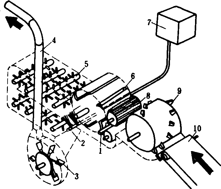 塔鲁普—805型秸秆调质机工作过程示意图 1.定刀;2.喷液管; 3.抛送风机; 4.输送管; 5.搅拌室;6.切碎滚筒;7.液箱;8.喂入辊;9.解捆滚筒;10.输送带 9JT—1型秸秆调质机,由输送喂入装置,搅拌混合装置,风送堆垛装置,传动及行走机构等组成。其工作过程是:先用普通铡草机将秸秆切成3~5毫米长的碎段,由人工送入秸秆调质机的喂料仓,经拨草轮将碎段均匀送到搅拌箱,在其入口处喷洒NaOH或尿素,经指状搅拌杆搅拌均匀后,由风机吹送到贮存点。用NaOH溶液调质的秸秆,可直接在地上堆成圆锥状垛,防止雨雪渗入,每垛3~6吨重,垛高在3米以上,两周后其残余含碱量小于允许值2.5%,通常可保存8个月以上。用尿素调质时,先在地面铺上塑料薄膜,将秸秆堆成方形垛,再用塑料薄膜密封。一个月后打开,经自然通风将残余氨气排净后方可饲喂。NaOH用量是秸秆干物质含量的3~6%,尿素为4~5%。该机生产率为0.8~1吨/小时,拖拉机的动力输出轴功率需11千瓦,风机输送距离为10米。 |