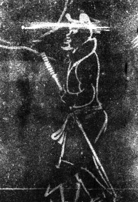 | 释义 | 佩剑人物图 【作品赏析】: 这是一个武士的形象,怒目扶剑,处于高度戒备之中。 向前飘动的胡须和衣带,更显出武士于风雨中屹然不动的雄姿。整幅图用笔冼练、快速,笔墨略到,便能够移人心目,有如一张古代武士的速写。 剑是古人随身佩带的武器,与戈、戟等相比,属短兵器。就剑这种武器而言,还有长、短之分。 一般防身佩带的剑,大约在四尺左右;匕首,是一种容易隐蔽,藏在身上的短剑;长剑,从一些史书的记载来看,可能主要用于战争和处于戒备状态时佩用,如屈原《九歌·国殇》中描写的战士所持之剑、荆轲刺秦王时秦王所佩之剑,都是长剑。本图人物所佩之剑,也为长剑。 看来并非仅仅用于防身,而主要用于格击。。