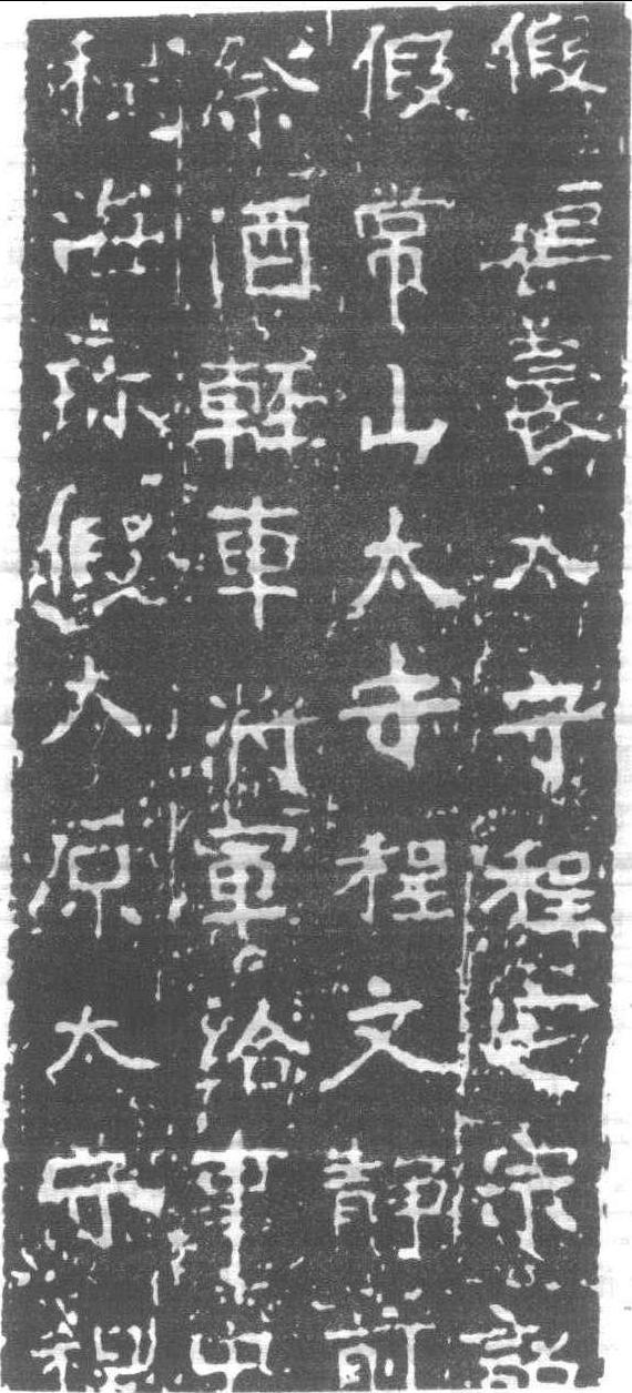 程哲碑 (局部) 亦曰 〈代郡太守程哲碑〉。東魏·天平元年 (534)刻。小楷三十二行,行四十五字。題額刻有小字 “天平元年”云云四行。近代與〈關勝誦德碑〉在山西潞安府長子(今山西長子縣) 同時出土。《通志金石志》曰:“此碑近年經訪得。摩崖運刀艱難,鋒芒少,然完好,僅缺數字。殊可貴。” 拓者秘而不言其所在,舊時著録均記在潞安,而 《中國書道史》謂立于太原傅青主祠前碑閣,與北周〈曹恪碑〉并立。據此,或可視為自出土地移置于此,并非 《通志金石記》所稱摩崖刻。是碑頗多隸意,渾穆雄深,字體齊整,充分具備東魏書法之特征。 |