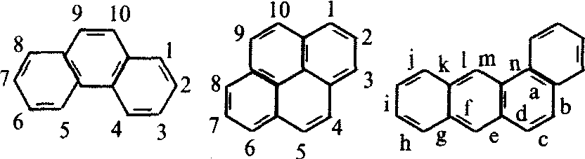并五苯 几个苯环通过两位或多位互相结合,成为角式的苯稠环称非直线式稠环,有的具有特定的名称,没有特定名称的均用含有最多环数的、有特定名称的环或直线式稠环作为母体环,母体按原环系编号的顺序,将各边标以a,b,c…,其余部分作为取代部分。如: