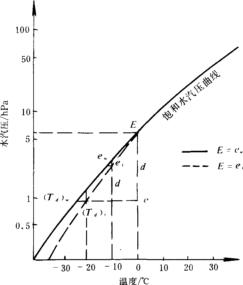 露点(霜点)温度 在保持空气中水汽含量不变的条件下,通过定压降温使空气中的水汽达到饱和时的温度。如达到的是相对于水面(或冰面)饱和状态的温度就称为露点(或霜点)。当相对湿度小于100%时,露(霜)点温度低于实际气温。气温与露(霜)点温度差值愈大,相对湿度就愈小。当空气中的水汽相对于水面(或冰面)达到饱和,即相对湿度为100%时,实际气温就等于露点(霜点)温度。在同一温度下相对于冰面的饱和水汽压小于相对于水面的饱和水汽压(如图示),因此霜点温度(Td);比露点温度(Td)w要高。当霜点为-10℃时,高出1.10℃;当霜点为-20℃时,高出2.84℃。