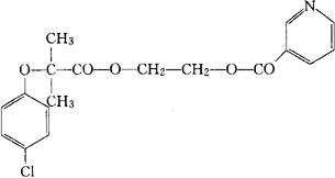 C18H1 8ClNO5=363.80 CAS-31637-97-5 2-(对-氯苯氧基)-2-甲基丙酸烟酸乙基-2-酯。 2-Hydroxyethyl nicotinate 2-(p-chlorophenoxy)-2-methylpropionate(ester). 2-[2-(4-氯苯氧基)-2-甲基-1-氧丙氧基]乙基-3-吡啶羧酸酯。 2-[2-(4-Chlorophenoxy)-2-methyl-1-oxopropoxy]ethyl-3-pyridinecarboxylate. 降血脂药。 Etofibrate,Alfoyan,Etolip,Nolfevan,Tricerol,XE 14-543. INN,USAN.