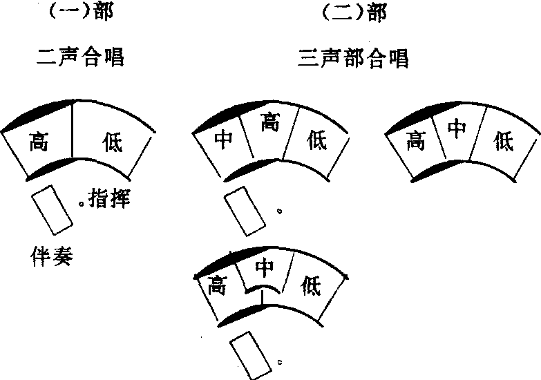 童声合唱在排练和演出中,究竟如何排列才能取得更好的声部和谐平衡与统一,也没有一个统一的规定,应按合唱团各声部人数多少、声音大小、声部织体关系以及指挥的习惯均有关系。但一般讲总是要高声部放在指挥的左手边,把低声部放在右手边,或把主旋律声部(一般是高声部)放在中间,声音容易发挥的地方,而把低音放在右手边,中声部放在左手边或者后边,因之就有多种不同的排列法。