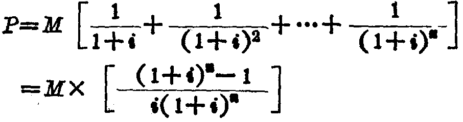 | 释义 | 等额年金法即逐年等额贷款(存款),N年累计一次偿还(取出)本利和的计算方法。例如,从某银行贷款P元,每年末偿付M元,n年后本利和全部还清。第K年末应偿还M元的现值为M(1+i)-h。n年末应偿还金额的现值总数为P元。则