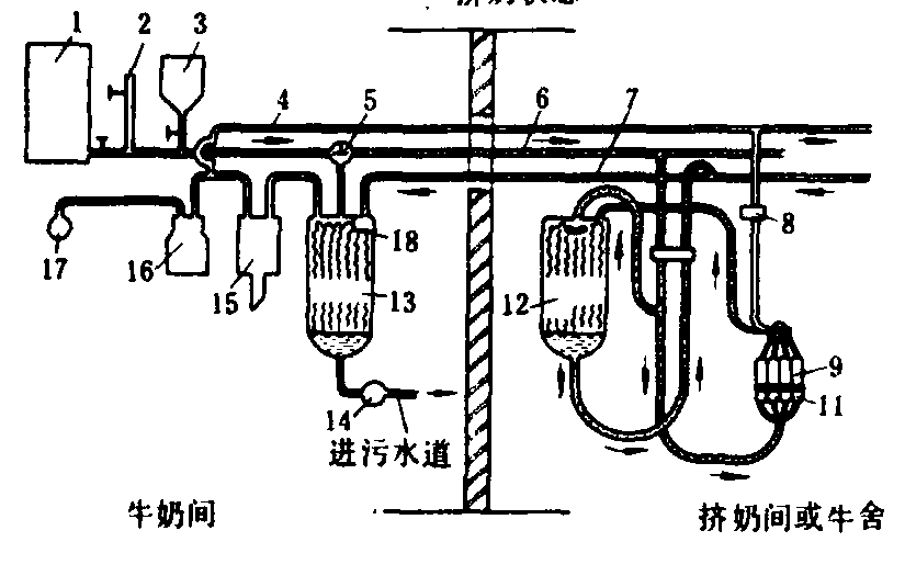 图3 挤奶台的类型 传送带式挤奶台由若干作串联排列的挤奶栏组成, 挤奶栏上装有轮子,由一传送链带动,在轨道上围绕一个矩形工作坑转动。工作坑内一人操作,每人每小时可挤奶牛数80~120头。 栏门启闭机构代替手工及时开闭挤奶栏门,供奶牛按正确的方向进出,栏门由压缩空气通过活塞连杆机构操纵,在工作坑内控制。 管道式挤奶机pipeline milker一种固定式挤奶机。工作原理与桶式挤奶机相同,不同之处在于不用奶桶盛奶,而是将挤奶杯中的奶用管道直接送往盛奶容器,因而在管路中增加了奶气分离器和输奶泵。如在管道式挤奶机中加上计量器,则称为计量式挤奶机。 |
