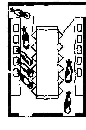 图1 管道式挤奶机 1.真空泵和动力装置;2.真空罐;3.真空调节器;4.气液分离罐; 5.真空表; 6、18.脉动器用真空管路;7.脉动器; 8.挤奶管路; 9.脉动真空软管; 10.挤奶杯; 11.集乳器; 12.牛奶软管;13、19.挤奶真空管路;14.集奶罐;15.牛奶泵; 16.牛奶排出管路;17.输奶管路;20.牛奶计量器; 21.输奶软管 挤奶间管道式挤奶机 安装在挤奶间内的管道式挤奶机,简称挤奶间式挤奶机。由挤奶台、挤奶器、真空装置、管路系统、清洗装置和多种辅助设备等组成。辅助设备有清洗乳房的热水和喷洗设备、奶牛进出挤奶栏门的闭门机构、自动喂精料的装置、挤奶杯自动摘卸装置(见奶牛挤奶设备)、牛奶冷却贮存罐等。其设备利用率高,生产率高,容易实现机械化管理。 挤奶间式挤奶机一般均配置牛奶计量器,牛奶需先经计量器计量(或抽样检测奶质),再流入集奶罐,挤奶和输奶分设两条独立的管路[图1(b)],使挤奶杯的乳头室内有较稳定的真空。在挤奶间内设有低于地面的工作坑,可采用低配管式输奶管路,管路配置低于牛站立的平面,因而不必使用高的真空度来提升牛奶,不易引起真空不稳定。 主要组成部分 管道式挤奶机用真空装置 用以供应挤奶器及由管路系统输送牛奶所需的真空。真空泵所需抽气量比提桶式挤奶机大。其必须抽气量为150+60n升/分;必须贮备量为100+25n升/分。其中n为同时工作的挤奶器数。 管路系统 管路由不锈钢管或硼硅玻璃管制成。每一条25毫米管径的挤奶管路上同时开动的挤奶器数不应超过4套。输奶管路应向集奶罐方向徐徐倾斜,以利于牛奶顺利流向集奶罐。 气液分离罐 是一玻璃容器,安装在真空罐与集奶罐之间的真空管路上,使真空管路与有可能接触牛奶的管路分开,防止牛奶或其他液体泄入真空管路和真空泵内。其有效容积不小于3升,内有防止液体溢入真空罐的浮球阀,底部装有排液阀。 集奶罐 安装在输奶管路的一端,汇集由输奶管路输入的牛奶,并使奶、气分离。罐的容量不小于23升。底部装有吸排器。常用的吸排器为不锈钢制的离心式奶泵,内有开启式单片叶轮,流量为4500~6300升/小时,扬程达3米。奶泵的工作是由集奶罐重量或罐内液面高低来控制的。重量控制是利用奶罐中的牛奶达到规定重量后,使奶罐下降,通过杠杆推动开关,启动奶泵;奶排出后,奶罐重量减轻而上升,使奶泵停止工作。液面控制装置由插入奶罐内的三根不同长度的金属棒和继电器组成,在奶液平面升高到与短棒接触时接通电路,启动奶泵排奶;当奶液平面降到离开长棒时奶泵停止工作,第三根棒为共同的电回路,采用电压为12伏的直流电源。 清洗装置 用来清洗残留在输奶管路、容器等表面上的奶垢等污物,杀死残留的细菌和微生物。包括热水器、洗涤液添加箱、洗涤槽(或洗涤挤奶杯的喷嘴)、转换阀门等。早期国际上流行的是蒸汽杀菌,以后发展用化学药剂洗涤,20世纪80年代以来使用洗涤剂加热水的办法来进一步提高清洗和杀菌效率。标准的清洗——杀菌法是:挤奶结束后立即用冷水冲洗残留在管壁和容器壁上的牛奶,再用含有次氯酸盐的热洗涤溶液(温度为60~80℃)冲洗管道约15分钟。图2为管道式挤奶机的清洗装置工作过程。在清洗时将挤奶真空管路上的转换阀门转到热水箱与挤奶真空管路接通的位置,使管路系统处于清洗状态。在半自动装置中,控制电路内装有定时器,使洗涤、杀菌、冲洗等过程以预定的程序自动进行,但需用人工配制浓度正确和温度合适的洗涤溶液。在全自动装置中,除整个过程全部自动化外,还能使进入管道中的洗涤——杀菌剂停留若干时间后再进行冲洗,并在清洗过程中间断放入空气,促使液流形成涡流,加强清洗效果。 挤奶台 奶牛在挤奶间式挤奶机挤奶时站立的地点。按工作方式可分为固定式、转台式和传送带式;按奶牛在挤奶台上的排列方式可分为并列式、侧进式、通道式和斜列式(图3)。按挤奶台围绕工作坑四周的边数又可分为单边形、双边形和多边形等。并列式固定挤奶台的挤奶栏与牛舍的牛床排列相似,牛与工人位于同一平面或高出250~400毫米,以减少弯腰操作。奶牛可单独进出挤奶栏。每人每小时挤奶不超过35头。侧进式固定挤奶台的挤奶栏排列在工作坑的两边, 牛在挤奶栏内头尾相接, 栏侧有前、后门, 供牛单独进出, 工作坑低于地面800~900毫米。通道式固定挤奶台与侧进式相似, 挤奶栏分隔门拉出时就形成统一的挤奶栏通道, 奶牛须按批进出, 但挤奶间跨度小。侧进式和通道式挤奶台上前后挤奶器之间的距离有2.4米, 为避免操作者走动距离过长, 每一工作边的挤奶栏数常为2~3个。侧进式挤奶台配合辅助操作的机械化, 每人每小时最高可挤奶50~63头。斜列式固定挤奶台上挤奶栏排列方向与工作坑纵轴成30°~55°角, 奶牛分批进出挤奶栏, 但前后挤奶器之间的距离缩短到0.9米, 所以在挤奶间长度相同的情况下可设置较多的挤奶栏(每边4~10个), 每人每小时最高可挤奶83~92头, 多边形挤奶台较常见的是菱形, 每工作边都有一排斜列式挤奶栏, 每边4~8栏, 每人每小时最高可挤奶牛96~122头。挤奶速度慢的奶牛可安排在一条工作边上, 以减少对挤奶间生产率的影响。