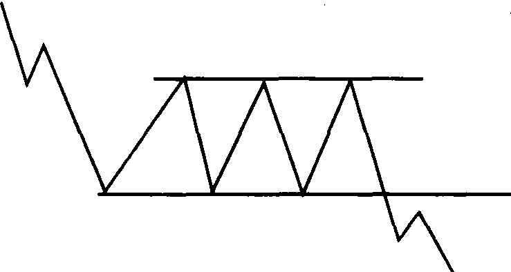 | 释义 | 箱形Box亦称“矩形”。一种典型的整理形态。股票价格上升到某水平时遇到阻力,股票价格下降,但很快便获得支撑而回升,当回升到前次相同高点时再次受阻,而下跌到前次低点时再得到支撑。上述短期高点和低点分别以直线连接起来,便可以绘出一条水平直线,该股票价格走势称为箱型形态。 箱形 箱形box亦称“矩形”。价格在两条平行的水平直线之间横向伸展形成的形态。表明市场买卖双方力量势均力敌,属于持续形态。该形态突破后,市场继续原来的走向。如图10-22所示: