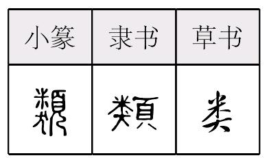【提示】米,中间是竖,不是竖钩。下面是大,不是犬。米和大末笔原本都是捺,上下两个捺笔紧邻,为避重捺,米末笔捺改点。 *类(類)lèi9画 米部 (1) 许多相同或相似事物的综合: ~别|种~|分~|同~|属于一~。 (2) 像;相似: ~似|~人猿|画虎不成反~狗。 类類lèi古代作頪,从頁,从米。读lèi。事物相似义。后作類。形声字。从犬,从頪,亦声。《说文》说:“种类相似,惟犬为甚。”指种,好多相似事物的综合。如:分类|类型|类推。组词如:种类。近代省“页”旁。现以为规范字。见《总表》。转为动词,类似,好像。如:画虎类犬。 类類★繁◎常★常◎异