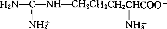 精氨酸arginine,Arg,R.α-氨基-δ-胍基戊酸。碱性氨基酸,等电点为10.76,水中溶解度大,有苦味。精子蛋白的重要组分。对于动物属于必需氨基酸,人体虽能自身合成,但合成速度较慢,故对人称之为半必需氨基酸。与生物体内尿素形成密切相关,还能形成磷酸精氨酸及磷酸肌酸,后者在能量代谢中有重要作用。在植物种子中,常作为氮源的一种形式被贮存以供种子萌发所需。代谢产物精胺和亚精胺,以及含精氨酸较多的碱性组蛋白,在稳定原核和真核细胞中的DNA以及在DNA的遗传信息表达过程中均起十分重要的作用。