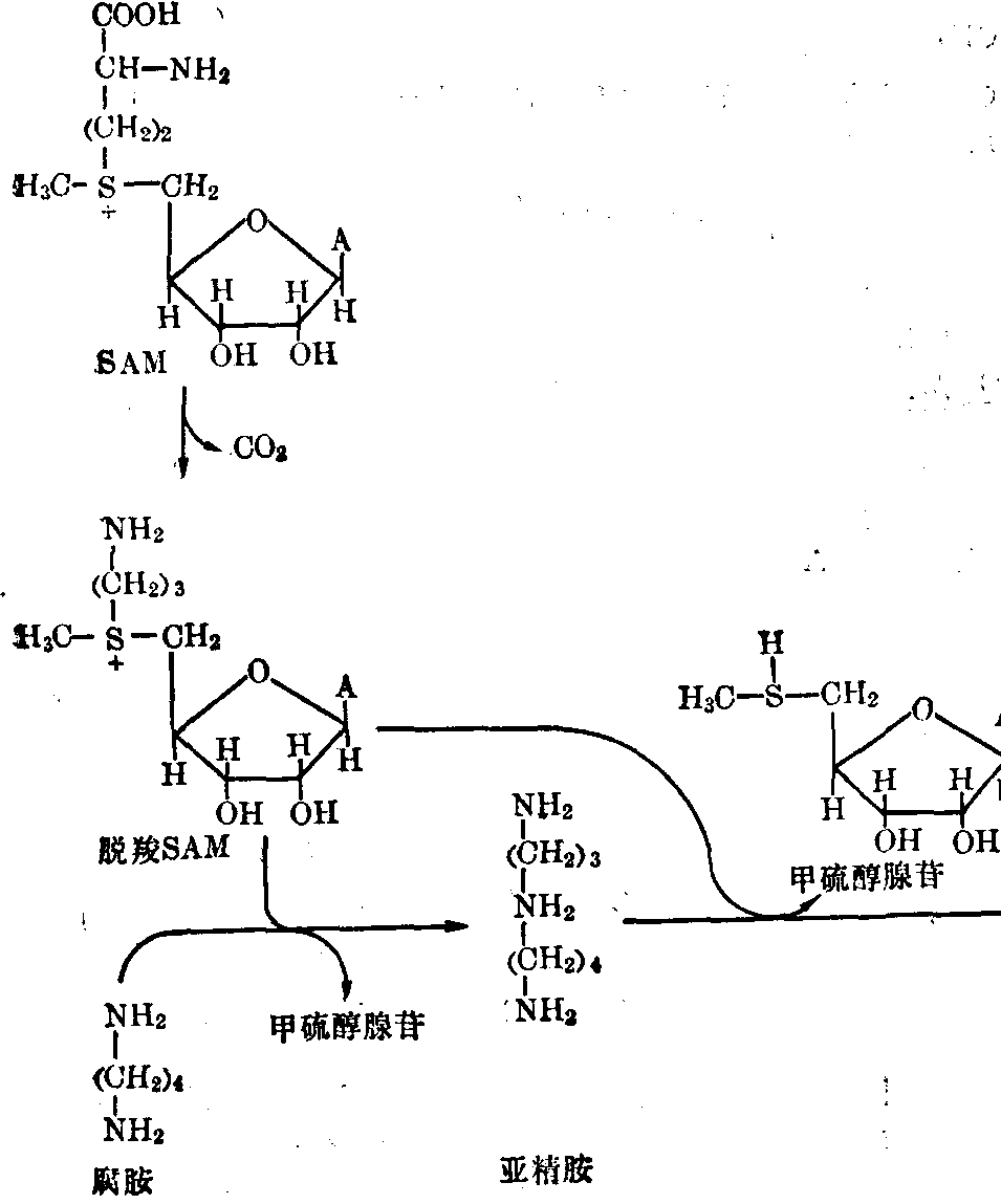 除了腐胺外,合成多胺还需要S-腺苷蛋氨酸 (SAM)的参加(见“蛋氨酸及其代谢”条)。在SAM脱羧酶的催化下生成脱羧SAM,然后经氨丙基转移酶或亚精氨合成酶的作用,使腐胺从脱羧SAM获得一个氨丙基而合成亚精胺,再经精胺合成酶的作用,使亚精氨获得一个氨丙基而形成精胺。