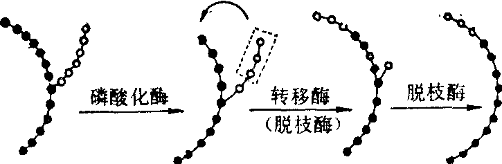 从糖原分解成1磷酸葡萄糖是不耗能的磷酸解作用,由磷酸化酶催化。1磷酸葡萄糖再在磷酸葡萄糖变位酶催化下生成6磷酸葡萄糖,后者是糖代谢各种途径的交汇点,在肝脏中它至少有四条去路,在绝大多数肝外组织主要有三条去路。 ![]() 6磷酸葡萄糖磷酸酶催化6磷酸葡萄糖水解生成葡萄糖,称为肝糖原的糖化作用。此酶在肝脏及肾皮质中活力最强(特别是肝脏),在其他组织中活力很小,甚至不含此酶。但肾皮质中糖原含量很少,故可认为肝中此酶对维持血糖浓度的相对恒定有非常重要的作用。 当糖原分子外部的1,4葡萄糖苷键受磷酸化酶分解而剩下四个葡萄糖残基时。就不再受磷酸化酶的作用。此时可经脱枝酶将剩余的葡萄糖残基转移到糖原分子别的枝链上,而使原来的枝链上只剩下一个以1,6糖苷键连接的葡萄糖残基,并将后者水解成自由葡萄糖,故脱枝酶具有转移葡萄糖苷和水解葡萄糖的双重作用。 ![]() 因接受葡萄糖残基而延长的糖原分枝则可再受磷酸化酶的作用而分解,故依靠磷酸化酶和脱枝酶交替作用可使糖原分子不断缩小,分枝也逐渐减少。 糖原合成与分解代谢的调节 磷酸化酶及糖原合成酶分别是糖原分解与合成的限速酶,它们都具有活性与无活性两种型式。各种调节糖原合成及分解的因素,一般都通过改变这两种酶的活性状态,而实现对糖原分解与合成的调节作用(图5)。