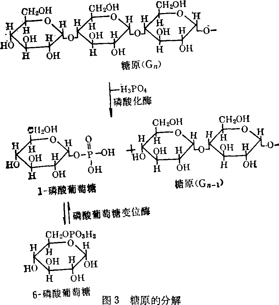图2 分枝酶的作用及糖原分子的增大 分枝酶使糖原增加分枝的作用很重要,一方面分枝增加了糖原的溶解度,另一方面增多许多非还原性末端。这些末端是糖原合成酶及磷酸化酶的作用部位,使糖原能继续增大分子,也易受磷酸化酶作用而分解。 糖原的分解 糖原分解是由一组与糖原合成完全不同的酶催化完成的,其整个过程可以用图表示: