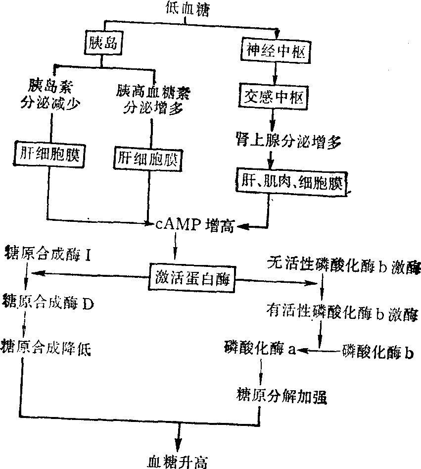 图5 低血糖时体内糖代谢主要调节机制 从上图可以看到,磷酸化酶的激活,实际上是一系列连锁酶促反应逐级放大的结果: cAMP→活化蛋白激酶→活化磷酸化酶b激酶→活化磷酸化酶b (即磷酸化酶a)。故凡能促使细胞内cAMP增加的信号,都能导致无活性的磷酸化酶活化,进而促使糖原分解加速。例如胰高糖素及肾上腺素都能活化肝脏或肌肉细胞膜上的腺苷酸环化酶,使cAMP增加,故能分别促进糖原的分解和酵解,而胰岛素却使cAMP减少,因而抑制糖原的分解。 糖原合成酶与磷酸化酶相反,受cAMP的抑制,即cAMP→活化蛋白激酶→抑制糖原合成酶。故胰高糖素及肾上腺素能抑制此酶而减少糖原合成,而胰岛素则能激活此酶而促进糖原合成。 糖原分解与合成两个对立途径中关键酶受同一调节系统的控制,有非常重要的生理意义,当机体受到某些因素影响,如体内血糖浓度下降时,如促使肾上腺素及胰高糖素分泌增加,这两激素通过cAMP蛋白激酶系统,一方面活化了肝细胞中磷酸化酶,使糖原分解加速,另一方面促使肝脏、肌肉及脂肪细胞中糖原合成酶失活,抑制了糖原的合成,这样更有利于迅速将葡萄糖释放至血液中。除此以外,血糖下降的信号,还能抑制胰岛素的分泌。胰岛素可降低肝脏及脂肪组织中的cAMP,与肾上腺素及胰高糖素有相反的作用,故能抑制磷酸化酶及活化糖原合成酶; 当它分泌减少时,也有利于糖原的分解。低血糖时这三种激素对糖原分解与合成过程的调节见图5。 ☚ 乙醛酸循环 葡萄糖异生作用 ☛ |