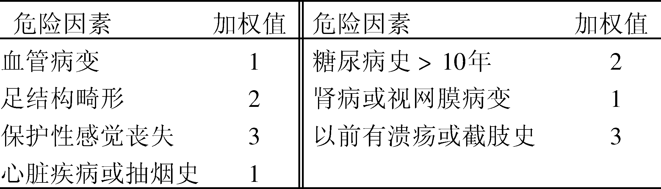 | 释义 | 糖尿病足的分组 糖尿病足的分组grouping of diabetic footGavin和Stess1993年报告根据糖尿病足危险因素的加权值积分,分为低、中、高危3组(见下表)。 糖尿病患者发生足部溃疡的危险因素 ☚ 癌痛程度分级标准 淋巴水肿的分级 ☛ |