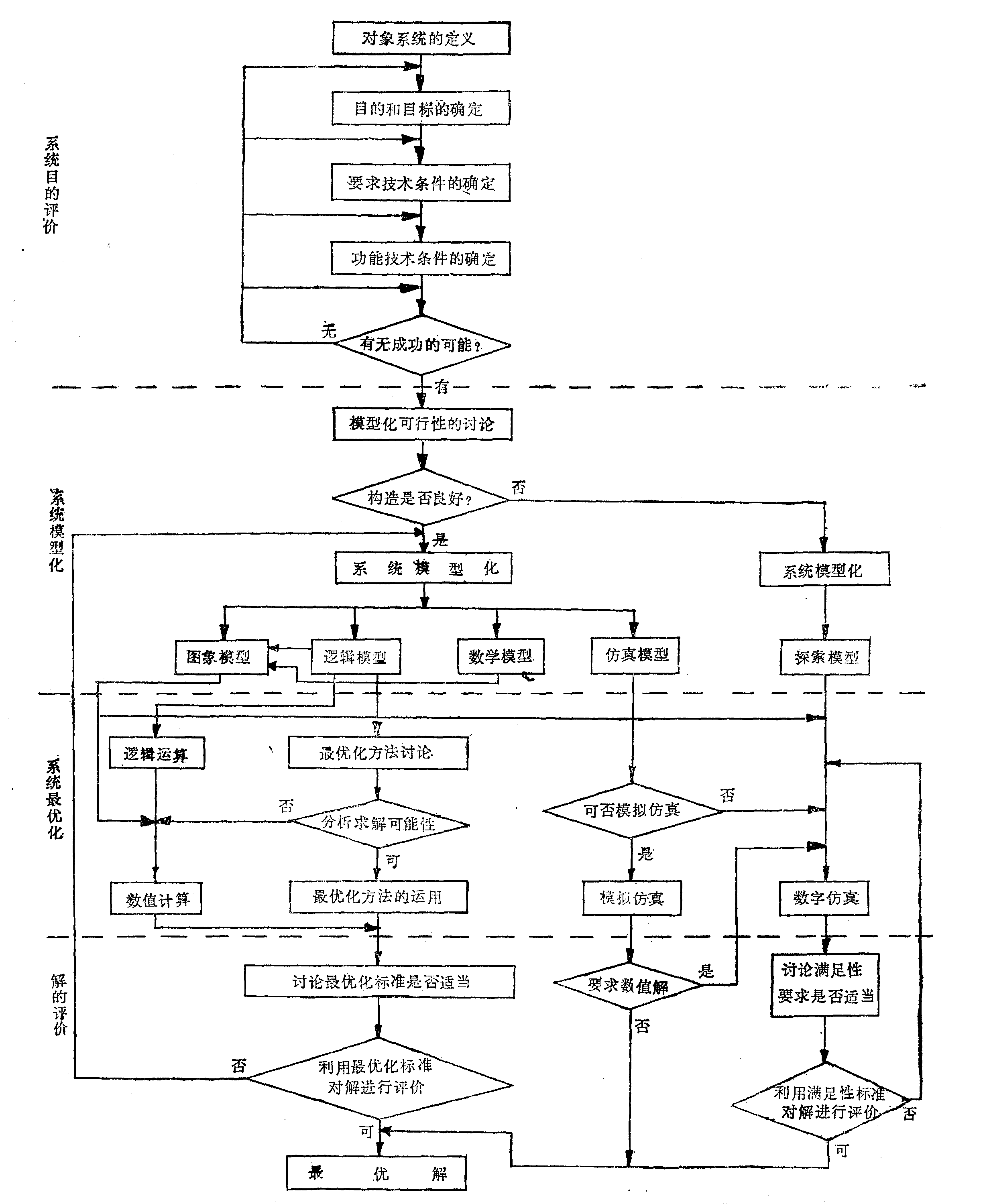 系统分析步骤流程框图 系统分析 系统分析从广义上说,系统分析就是系统工程;从狭义上说,就是对特定的问题,利用数据资料和有关管理科学的技术和方法进行研究,以解决方案和决策的优化问题的方法和工具。系统分析(Systems analysis)这个词是美国兰德公司在本世纪40年代末首先提出的。最早是应用于武器技术装备研究,后来转向国防装备体制与经济领域。随着科学技术的发展,适用范围逐渐扩大,包括制订政策、组织体制、物流及信息流等方面的分析。60年代初,我国工农业生产部门试行统筹方法,在国防科技部门出现“总体设计部”的机构,都使用了系统分析方法。美国兰德公司的代表人物之一希尔认为,系统分析的要素有五点:(一)期望达到的目标。复杂系统是多目标的,常用图解方法绘制目标图或目标树,以及多级目标分别相应的目标——手段系统图。确立目标及其手段是为了获得可行方案。可行方案是诸方案中最强壮(抗干扰)、最适应(适应变化了的目标)、最可靠(任何时候可正常工作)、最现实(有实施可能性)的方案。(二)达到预期目标所需要的各种设备和技术。(三)达到各方案所需的资源与费用。(四)建立方案的数学模型。(五)按照费用和效果优选的评价标准。系统分析的步骤一般为:确立目标、建立模型、系统最优化(利用模型对可行方案进行优化)、系统评价(在定量分析的基础上,考虑其它因素,综合评价选出最佳方案)。进行系统分析还必须坚持外部条件与内部条件相结合;当前利益与长远利益相结合;局部利益与整体利益相结合;定量分析与定性分析相结合的一些原则。新闻单位的自身体制改革的科学方法是系统分析。根据改革目标,建立新的体制模型;根据模型分析各变量因素及其关系,确立若干可行方案;再对方案进行评价,选择最佳方案。 ☚ 系统工程 系统方法 ☛ 系统分析 系统分析创建新系统或改善现有系统时对系统进行定性或定量评价的一种方法和过程。它从系统的观点出发,对事物进行分析或综合,找出各种可行方案,使决策者从许多可行方案中选择最优方案。进行系统分析时,当前利益要和长远利益相结合;局部效益和整体效益相结合; 定量分析和定性分析相结合; 内部因素与外部因素通盘考虑。系统分析一般有五个步骤: ☚ 系统开发 系统设计 ☛ 系统分析 系统分析Systems Analysis又称“系统方法”。即将复杂研究对象纳入系统立场,以系统总体优化为目标,以系统思路为基本思维脉络,对系统的目的、结构、功能、效益等进行综合、全面分析的一种方法。系统分析是系统工程的一个最重要的组成部分,是系统优化设计的前提。系统分析的核心是系统观念和系统思路,系统分析首先要对研究对象的系统边界进行界定,然后从系统与环境、系统单元与单元、结构与功能、输入与输出等几个方面展开具体的分析,在此基础上再围绕系统总体优化目标进行综合,找出相应的可行方案,指明各可行方案的条件、前景,供决策者选择。 ☚ 正交分析法 技术经济仿真 ☛ 系统分析 系统分析亦称“系统方法”。它是系统工程的一个重要程序和核心组成部分。指用多种科学知识,在定量计算和分析的基础上结合成本效益,为选择具有特定目标的多种方案提供决策的一种方法。系统分析是由美国兰德公司正式提出的,兰德公司奈德给出的定义是: 系统分析是一种研究方法,它能在不确定的情况下,通过对问题的充分调查,找出其目标和各种可行方案,并通过直觉和判断对这些方案的结果进行比较,帮助决策者在复杂的问题中作出最佳决策,使系统整体效益达到最优。目前比较流行的系统分析基本类型有三种: (1) 兰德型。其分析目标是优化决策,其方法观念是准确地追究问题、探索诸有关因素间的关系、重视建立模型与经济效益评价、实行多方案筛选,其适用范围包括政府部门的经济社会问题,企业经营管理问题。(2) 索普型。其分析目标是改善事务管理,其方法观念是严格地分析现状、扩大电子计算机资料处理系统的使用范围,其适用范围包括企事业等业务管理系统。(3) 事务分析型。其分析目标是管理方法通用化,其方法观念是精细地分析现状、改进事务管理工作程序、优化工作分派。其适用范围包括程序性强的事务管理。通常所说作为辅助决策技术的系统分析,多属兰德型,它广泛地用来作为解决具有下述条件问题的一种方法: 需要将具有一定目标的复杂系统作为一个整体分析; 能够实现系统目标的可行方案必须有一定的数量; 各种可行方案均可用有限的变量及模型加以描述; 需要对每个可行方案作出完整论证; 需要作出定量分析及定性评价,并能给出更高层次的定性分析。 ☚ 系统工程方法论 系统分析原则 ☛ 系统分析systems analysis 系统分析xi tǒnɡ fēn xī指以系统的整体效益为目标,以寻求特定问题的最佳策略为重点,并运用定量分析方法和决策者的价值判断,以求达到最有利的决策。systems analysis, systematic analysis 系统分析 系统分析systems analysis为了选择达到某一系统目的的最佳手段,对该系统进行的研究。它是一个根据已知系统的内部构造来决定系统性能的过程。主要工作包括:构造所研究的系统的数学模型,然后对这个数学模型进行数学分析,并把分析结果用于原系统。构造数学模型和解释分析结果都要求有丰富的经验。系统分析要求了解系
