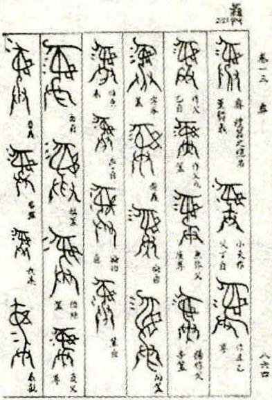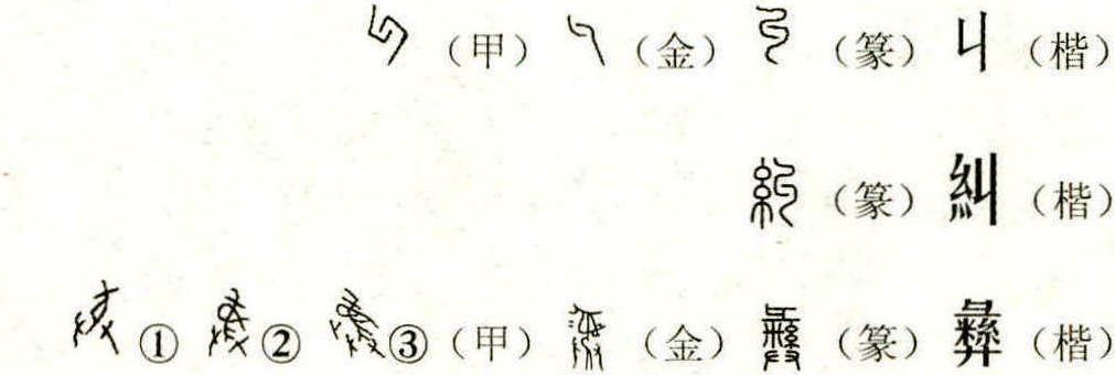 說“糾”必先說“ ”。“ ”甲骨文“糾”之本字,它是由太陰符號“⚏”轉換而來,或者說由兩個陰爻轉換而來並呈現相互勾連的形狀,為會意字。“糾”金文作“ ”,小篆作“ ”。楷書一生為二,“丩”只作組字偏傍用,另造“糾”字。“丩”殷墟卜辭用作: (1)糾葛,“王左惟有它,呼糾左”。 (2)矯正,“糾往…”、“呼糾…”。 “糾”從糸,丩亦聲,意音字。糸,生殖上的線形不斷或網絡纏繞狀態,其本意為事物的纏繞集結。引伸有以下意義: (1)紛亂交合。《楚辭·九章·悲回風》:“糾思心以為纕兮,編愁苦以為膺。” (2)集合收攏。《左傳·僖二四年》:“召穆公思周德之不類,故糾合宗族于成周而作詩。” (3)舉發矯正。《尚書·冏命》:“繩愆糾謬,格其非心。” (4)曲折繁復。南朝(梁)·何遜《渡連圻》詩句:“洑流自洄糾,激瀨視奔騰。” “丩”的本意是彎曲與相互勾連。“丩”以它的形義孳乳了以下漢字: 句(勾):從口(厶)。勾句同源,金文作“ ”。“句”口腔器官折曲而發出的音讀和文章曲洄中的停頓;句子,文章的基本單位;“勾”彎曲的相連。 叫(嘂):從口。口腔器官折曲而發出的呼喊鳴號。 虯:從虫。觸鬚卷曲的一種動物。 收:從支(動作符)。對糾紛的拾掇。 赳:從走。肌肉收縮中的雄健勇武狀。 朻:從木。樹木向下彎曲謂朻。 訆:從言。用於屈曲的大呼。 互:從二(象天地)。世間事物的相向交錯和彼此連接。 牙:(金文作“ ”)從二(指各自)。 臼齒的相互依靠和交錯切磨形狀❶。瓦:(小篆作“ ”)從一。相互勾連用於覆屋的陶片。彑:(丩丨)從一(為地)。 “彑”是震卦符號“☳”的轉換。震為動,在這裏標意為下頜的主動。因此,從“彑”所異構的漢字多指牙齒或相似牙齒交錯切磨和纏繞的動感狀態,例如: 彔:從水。轆轤絞水狀 ❷。 彖:從豕。野豬類牙齒殊利的動物即貒。《易經》中的彖辭,其實就是取意彖(貒)對物體的了斷。彖辭就是每一卦結論性的文字斷語。“篆”則是最初將這種斷語刻(寫)在竹簡竹上。 㣇:( 丨 )從人,從巾(爪)。爪牙具利的貍子。 彘:(ㄓ)從比,從矢。比矢,雌雄交配,詈語中善動脣吻的豬。 彙:從冖(勹),從果。 (1)以牙連類同進,果腹的造義,故以類相從為之彙。《字彙》是明代梅膺祚編撰的一部字典,共收33179字。 (2)析情連類,聚合者是也。“文改”以後彙廢而“汇”興,識淺見浮,戀荒食吣,不一而足。 現在著意說這個“彝”字,因為它是當代字釋家爭論較大的一個古漢字。 彝,甲骨文❶( )從“屯”( ),從卄(拱之本字)為會意字。“屯”是春之本字,它是由震卦符號“☳”的兩個陰爻和一個陽爻轉換而來。震為動,為長男,動物屬龍,季節在春,方位在東,是雷澤氏的擬人。甲骨文 ❷( )的“彝”,將“屯”換為“女”,女上一橫(成年女性),女為長女,又增加四象符號“⚌”,仍為會意字。 “⚌”為太陽,方位在南,季節為夏,同時朱雀(鳳)乃南方之鳥。雙手共同對始母華胥氏、雷澤氏形象進一步作尊奉的塑造。甲骨文 ❸( )的“彝”,給“女”加畫,似乎向“鳳”的形象趨進,已具有鳳的頭尾的雛形,“ ”(卜)是太陽符號“⚌”的轉換,在這裏既具男性角色,又有陽剛勃興之義。“彝”甲骨文三形下部都有“廾”在,證明它是一個不可或缺的字符。“廾”雙手高舉華胥氏的擬人,合而進奉,表示的是虔诚之意和敬重之情。 甲骨文“彝”的標意是,對始母華胥氏同時也隱有對雷澤氏的敬重,其表意為後裔對祖先的敬重和祭祀。 “彝”,容庚《金文編》收有201個字形,且無一重復,證明對字義的不解在形體傳承上的變異和差距。但是,盡管金文形狀各異,與甲骨文拉大了距離,而金文字形中卻保留了如下基本要素:“卄”、“ ”(人)、“女”、“糸”、“⚌”,這就為我們打開“彝”的秘密提供了鑰匙。小篆和楷書的“彝”( ),從米,從糸,從廾,從彑,彑亦聲,為意音字。秦漢時代是中華漢字的旺生期,這時的“倉頡”們一般對古字形的把握是準確的,因此在隸變過程中方顯理性的功夫。