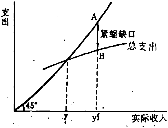 | 释义 | 紧缩缺口 紧缩缺口deflationary gap总支出不足以产生一个确保充分就业的国民收入水平。在简单的收入——支出模型中,紧缩缺口是由与45°线相交并低于充分就业国民收入水平的总支出函数表示出来的。如图所示。