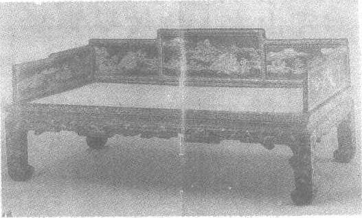 清雍正。长205厘米,宽110厘米,面高50厘米,通高89.5厘米。北京故宫博物院藏。列屏式的床围环围着左、右、后三面,以后部中间为最高点,依次台阶式降低。其采用攒框装板心法做成。藤编软屉。四条内翻马蹄足。床通体髹微泛紫色的黑漆,上以描金法遍饰山水人物小景、折枝花卉、缭绕的祥云及回纹等纹饰。造型厚重,形体庞大,装饰繁琐,为典型的清式家具。是雍正时期的家具精品。
