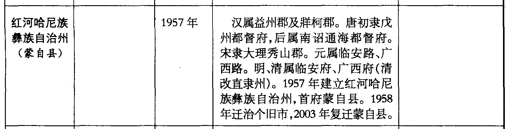 红河哈尼族彝族自治州(蒙自县)1957年汉属益州郡及牂柯郡。唐初隶戊州都督府,后属南诏通海都督府。宋隶大理秀山郡。元属临安路、广西路。明、清属临安府、广西府(清改直隶州)。1957年建立红河哈尼族彝族自治州,首府蒙自县。1958年迁治个旧市,2003年复迁蒙自县。