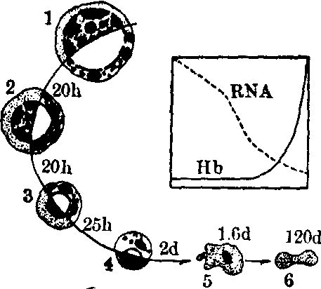 红细胞发生的形态变化与血红蛋白生成的关系 1.原红细胞 2.早幼红细胞 3.中幼红细胞 4.晚幼红细胞 5.网织红细胞 6.成熟红细胞RNA为核糖核酸,Hb血红蛋白,h和d分别为增殖时和更新时 红细胞发生的动力学及调节因子 一般一个原红细胞经过72~88小时、四个发育阶段、4~6次有丝分裂,发育成多个红细胞。原红细胞和早幼红细胞的增殖周期时间约为20小时,中幼红细胞约为25小时。晚幼红细胞和网织红细胞不能分裂,该阶段所经过的时间以更新时表示,前者约为2天,后者约为一天半。成熟红细胞的更新时约为120(112±9)天。根据已肯定的数据推算,成人按体重每天约产生红细胞1011/kg,骨髓红细胞约为1010/kg,其中有核红细胞约为5×109/kg。调节红细胞生成的因子中,最重要的是红细胞生成素,其作用是使红细胞系造血祖细胞加速增生、分化为原红细胞;其浓度较高时能促使幼稚红细胞增殖、分化;可加速血红蛋白合成; 能促使成熟红细胞释放。体外培养红细胞集落所必需的红细胞集落生成刺激因子就是红细胞生成素。另外,雄性激素也促进红细胞的发生,此作用已用于临床。 ☚ 造血干细胞 粒细胞发生 ☛ |