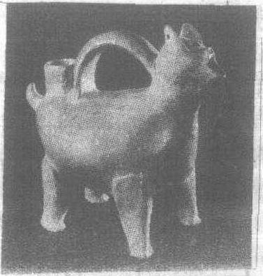 新石器時代陶塑作品。山東省寧陽縣堡頭村出土。高二一·六厘米,長二二·四厘米。紅色陶器呈獸形,昂首張口,四足直立,短尾上翹,背上有鋬與管狀口。神態生動。現藏山東省博物館。