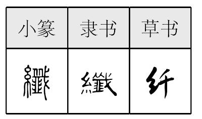 1. xiān纤1(纖) 甲骨文和小篆作㦰(jiān)。从戈杀多人。歼灭义。是歼(殲)的本字。小篆又如韭旁作韱,仍是多杀人义。杀人如斩麻。引申有纤细义。是纖的本字。会意兼形声,声母演变为旁纽双声,如昔惜借籍例。纤细义略引申为细小。组词如:纤维|纤尘。解放前群众从歼类推,简化为纤1,现作规范字。见《总表》。
