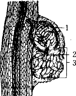 一种根结线虫的卵囊 1.雌虫 2. 阴门 3. 卵囊及卵 |