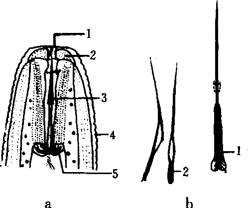 线虫口针及齿针 a.口针侧面观:1. 口孔 2.唇片 3. 口针 4. 角质膜 5. 口针基部球 b.齿针:1. 剑属 2. 毛刺属 |