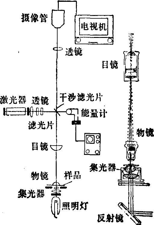 图 细胞激光显微镜 式中△为光学筒长(约170mm),f1为物镜焦距,f2为目镜焦距。这样得到的F就比单透镜的焦距短,聚焦光斑直径d就可达几个微米的数量级。细胞激光显微镜在细胞显微外科、细胞遗传学、肿瘤细胞学、实验胚胎学中都有广泛的应用。它使激光的应用进入到细胞水平。一般细胞的直径在30μm左右,利用直径几个微米的激光微光束,可对单个细胞的局部进行定位照射而又不损伤其他部分。通过选择性的照射可以破坏或损伤细胞膜的一个部分、细胞中的线粒体、中心粒、核仁、或是单个细胞中某一染色体的局部。应用这种研究方法可探讨各种激光对细胞、细胞器的作用,也可以探讨细胞内各种结构和功能的关系,以及细胞的合成、分裂、遗传等生命活动。对于细胞遗传特性的研究,还可进一步为定向育种提供方便,对于探索肿瘤细胞恶性分裂的原因也具有实际意义。在实际应用中,由于各种照射部位对各种波长的激光的吸收特性不同,往往在照射前需用光敏染料给细胞染色,常用染料有二十多种,如:烟鲁绿B、吖啶橙、亚甲基蓝等。有人就用烟鲁绿B给细胞的线粒体染色,然后用聚焦光斑为6μm的红宝石激光束对线粒体进行照射,探讨了线粒体在细胞生命活动中所起的作用。另外还有人用吖啶橙对蝾螈肺组织培养细胞染色,再用氩离子激光微光束照射,在染色体上产生了0.6~0.8μm的损伤,观察这种损伤如何达到子代细胞,即可了解损伤的这段染色体的遗传上的作用,同时也可探讨染色体的损伤和修复过程。总之用激光微光束解剖细胞要比以往使用的玻璃显微刀和热针优越得多。在实验胚胎学中,可用激光微光束来破坏一个正在分裂的卵裂球中的一个细胞,然后观察细胞随后发育的情况,通过这种研究可为胚胎发育的畸形机理提供某些依据。用激光微光束可迅速地给一个细胞“去核”,这为遗传工程的研究提供了方便。 现在已用细胞激光显微镜产生的微光束来制作生物学研究用的组织标本,标本最小面积达12μm。 ☚ 细胞电泳 激光发光分光镜 ☛ |