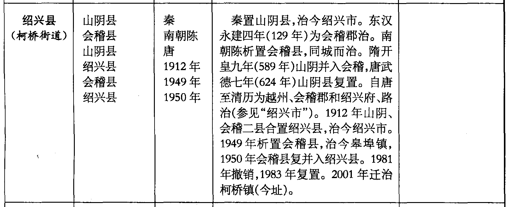 绍兴县(柯桥街道)山阴县会稽县山阴县绍兴县会稽县绍兴县秦南朝陈唐1912年1949年1950年秦置山阴县,治今绍兴市。东汉永建四年(129年)为会稽郡治。南朝陈析置会稽县,同城而治。隋开皇九年(589年)山阴并入会稽,唐武德七年(624年)山阴县复置。自唐至清历为越州、会稽郡和绍兴府、路治(参见“绍兴市”)。1912年山阴、会稽二县合置绍兴县,治今绍兴市。1949年析置会稽县,治今皋埠镇,1950年会稽县复并入绍兴县。1981年撤销,1983年复置。2001年迁治柯桥镇(今址)。