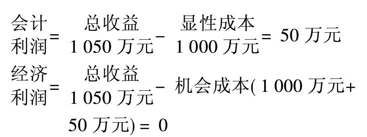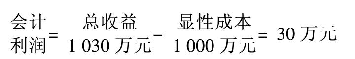 从会计账目看,该企业是盈利的,其盈利等于机会成本中所包含的由隐性成本代表的净收益;从经济学的角度分析,该企业不盈不亏。 (3) 会计利润为正,经济利润亦为正。如果该企业的产品在市场上销售时价格提高幅度较大,其一年内出售产品的总收益上升为1070万元。这时会计利润为70万元,经济利润为20万元。用公式表达为: