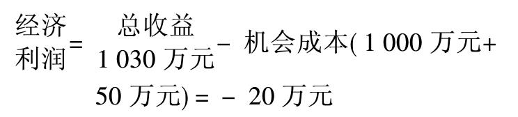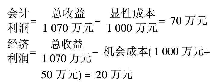 假如该企业将这1000万元显性成本存入银行,年利率为5%,那么一年内可获得利息收益50万元。由于该企业选择的是进行生产,而没有选择把钱存入银行,就放弃了这50万元的利息收益。这50万元便是其隐性成本。这时,其机会成本为1050万元,即1000万元显性成本加上50万元隐性成本,而其经济利润为-20万元。用公式表达为: