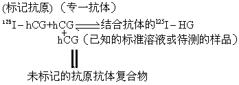 放射免疫测定法 这是一种利用免疫反应和同位素技术在体外进行超微量测定的方法。其基本原理建立在hCG (LH)、125I-hCG与hCG专一抗体结合点进行竞争结合的基础上。可以下式表示: