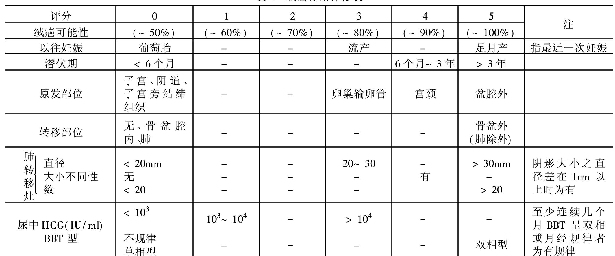 绒癌诊断评分表score table of diagnosis of choriocarcinoma