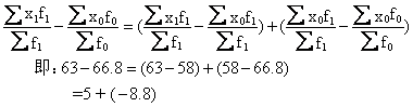 可变构成指数、固定构成指数和结构影响指数的关系是: 可变构成指数=固定构成指数×结构影响指数 即:94.3%=108.6%×86.8% 从绝对数看: