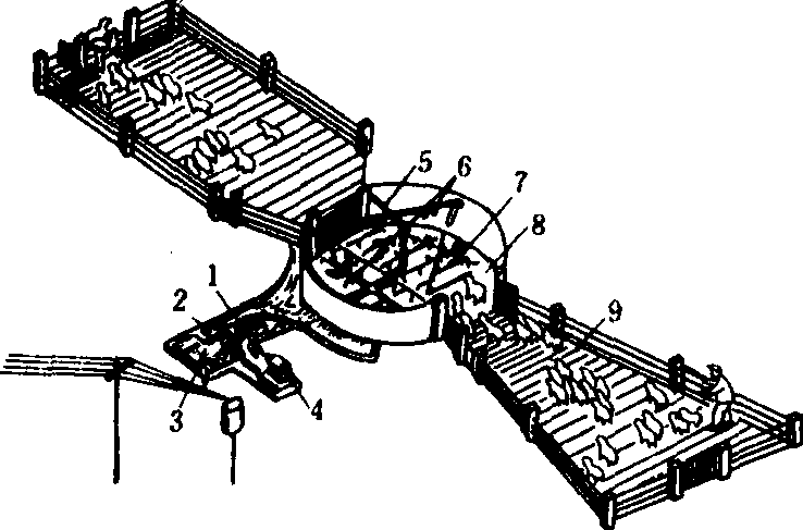 家畜淋药设备示意图 1.水泵;2.过滤池; 3.药液池; 4.电动机;5.上喷管道;6.中央喷头; 7.下喷管道;8.淋场;9.待淋栏 气流喷药设备 利用气流作为药剂载体,使药剂随气流渗入毛层来消除羊体上的寄生虫。药剂喷口置于风机所产生的紊流之中,杀虫剂在药液泵压力作用下,由喷口经强烈的空气搅动后,随气流通过喷嘴喷出;喷嘴分别设在羊群通道的上、下和两侧,在羊群通过时,载有药物的气流吹散羊毛,杀虫剂粘附在羊毛四周的皮肤上。该设备对羊体的杀虫效果好,需水量低和适应性强。 |