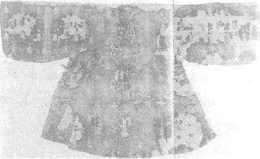 明。衣长135厘米,两袖通长234厘米,大襟宽135厘米,小襟宽98厘米,袖宽55厘米,袖口宽18厘米,领贴边宽3.2厘米,领口横宽17厘米,领口直长19.6厘米。1958年北京定陵万历皇帝棺内西端南侧出土。北京市定陵博物馆藏。“衮服”亦作“衮衣”,是古代皇帝祭天地宗庙等大典时穿着的礼服。“十二章”图案纹依次为日、月、星辰、山、龙、华虫、宗彝、藻、火、粉米、黼、黻。十二章纹均有取义:日——日中有三足乌,彩云托之;月——月中有玉兔捣药,下彩云护之;星辰——三星并列,以直线相联,取其照临;山——山岳一座,取其稳重;龙——五爪龙一对,身被鳞甲,取其应变;华虫——彩羽雉鸟一对,取其文丽;宗彝——祭祀礼器,绘虎、蜼各一,取其忠孝;藻——丛生水草,取其洁净;火——若光焰之状,取其光明;粉米——白米,取其滋养;黼——斧形,取其决断;黻——作亞形,或两兽相背形,取其明辨。皇帝在最隆重的场合穿十二章纹礼服。此件缂丝衮服由带左袖的大襟,带右袖的小襟,领部至下摆底部的后片三部分组成。里外三层,后片呈帘幕状下垂,与其他不相连缀;里衬是黄色方目纱,面与里衬之间有衬层,以绢、纱、罗织物杂拼缝制而成。两腋下均钉丝带鼻,并留有开口,以便与长襟之上的两根罗带相栓结。在衮服的前身、后身各并排绣直径为32厘米的三只团龙,两肩各绣直径为29厘米的一只团龙,下摆两侧各绣直径为28厘米的二只团龙。在两肩、圆领背部下方和肩部分绣有十二章纹的日、月、星辰、山峰。肩部下侧绣十二章纹的4只华虫。在前后身相对排绣有4行十二章纹的宗彝、藻、火、粉米、黼、黻纹。此衮服上有绢质墨书标签:“万历四十五年……衮服”等字样。“万历四十五年”即公元1618年。