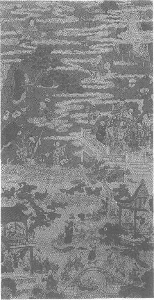 | 释义 | 缂丝瑶台百子祝寿图轴 缂丝瑶台百子祝寿图轴清。长176.5厘米,宽90.5厘米。江苏省南京博物院藏。此图轴分上下两部分,上部表现天上,背景为大红,白云缭绕,青松、桃树、寿石穿插其间,王母披羽乘鸾飞临,寿星捧桃跨鹤相迎,老翁驾云飘至,麻姑捧筝乘舟而来;下部八仙聚集于瑶台,由瑶池水浪过渡到凡间世界,背景以月白色为地色,与天界形成鲜明对比。其间亭阁、树木、山石、石桥、流水、百子戏耍其间,姿态各异。此图轴运用子母经、平缂、掼缂、缂金等缂丝技法,在大红、月白色地上配以三蓝、三绿,使画面更显清润繁丽。